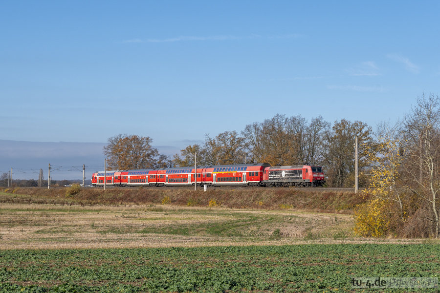 Auf Grund von Fahrzeugengpässen wurde vor einigen Jahren ein Umlauf wieder fest auf Doppelstockwagen umgestellt. In der Regel kommt hier eine Garnitur von der S-Bahn Dresden zum Einsatz. Am 16.11.2025 hatte die 146 021 die Ehre einen zweiten Umlauf auf dem RE50 zu befördern, aufgenommen bei Altenbach.